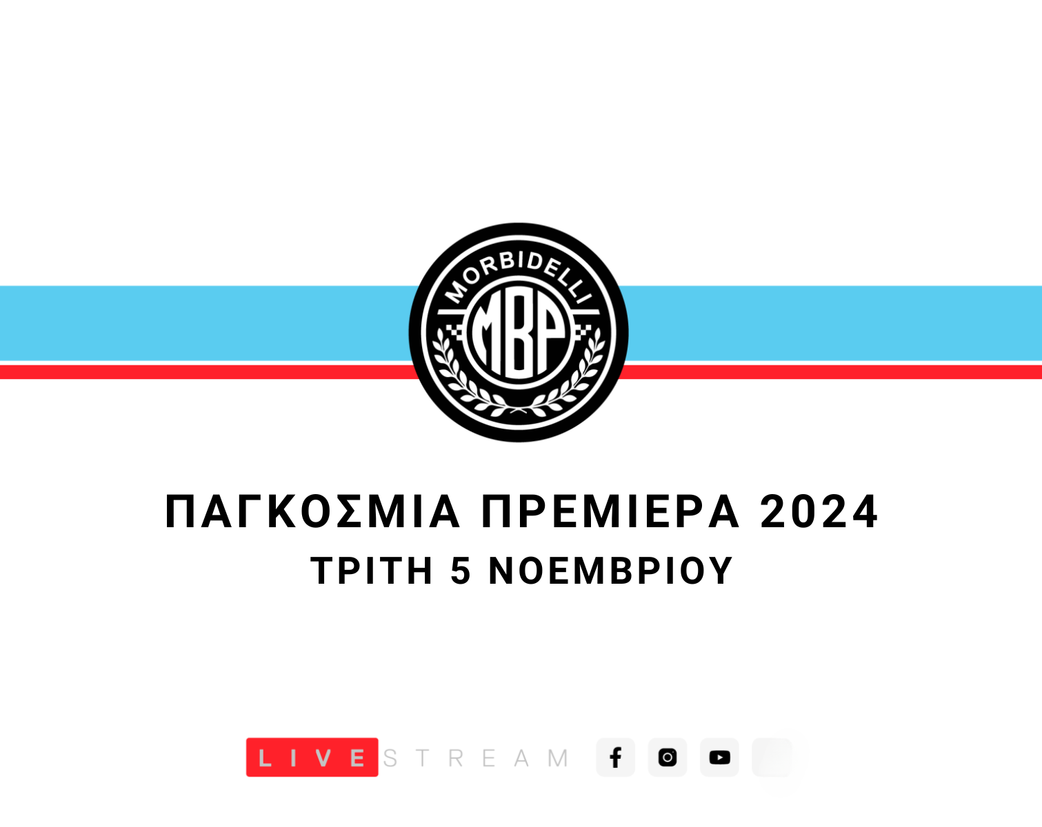 Για όσους δεν μπορούν να παρευρεθούν στην EICMA, η Παγκόσμια Πρεμιέρα της Morbidelli θα μεταδοθεί ζωντανά στο YouTube και στο Facebook. Μην χάσετε την αποκάλυψη τριών νέων μοντέλων και άλλες συναρπαστικές ανακοινώσεις την Τρίτη 5 Νοεμβρίου, 13:00 (ώρα Κεντρικής Ευρώπης).