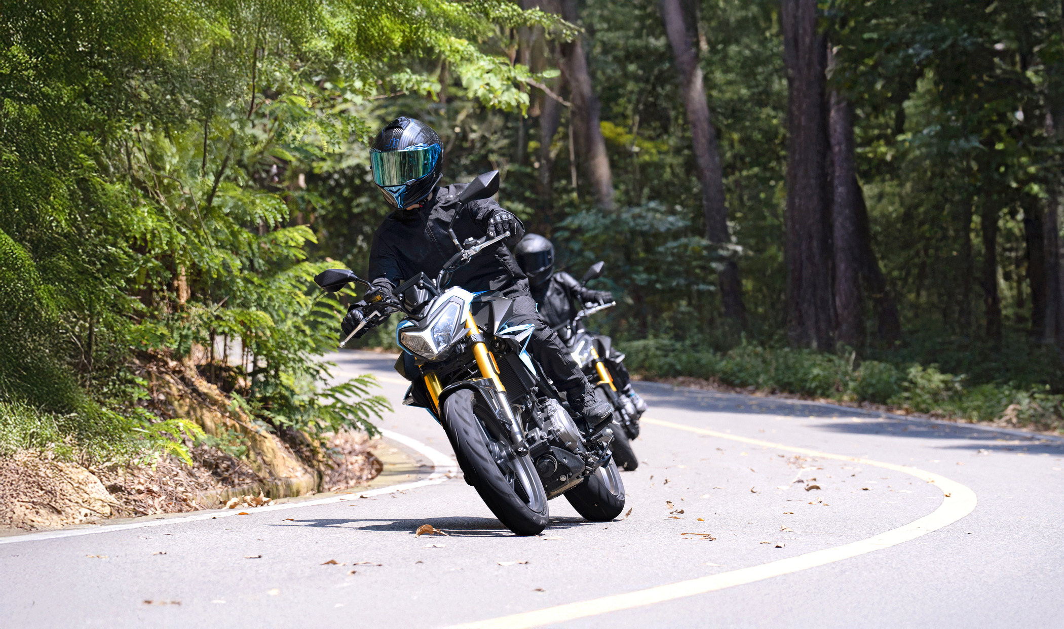 The sport-oriented suspension setup, featuring a 41 mm upside-down front fork and a Pro-Link rear monoshock, provides stability and confidence on fast curves and uneven asphalt, maintaining control when the pace picks up.