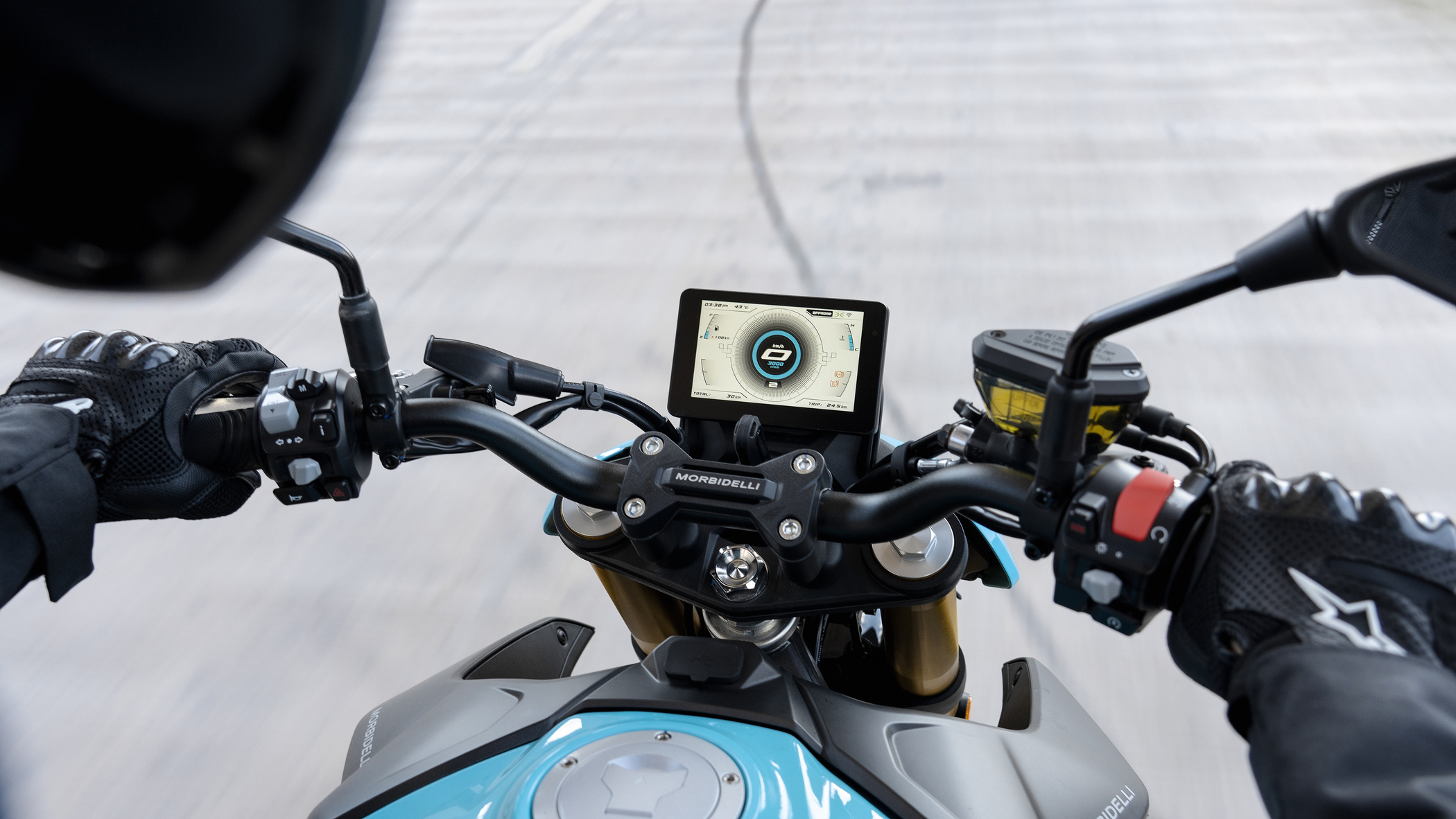 A 5-inch TFT display sits at the center of the cockpit, offering clear visibility and integrated navigation. Through Morbidelli Connect, riders can access GPS navigation via app, a remote anti-theft system, and a handlebar-mounted SOS emergency button, with the official app included for one year.