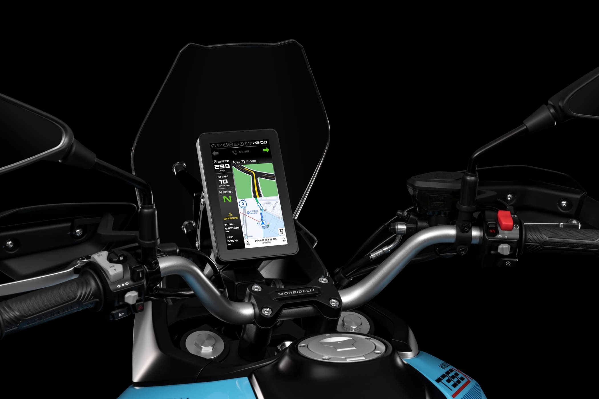 At the center of the cockpit sits a 7-inch vertical TFT display, offering clear information and intuitive interaction. Through Morbidelli Connect, riders gain access to navigation, anti-theft functions, SOS assistance, and smart connectivity features designed to support every journey.